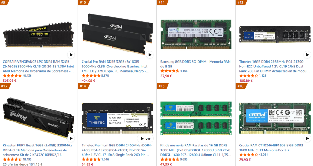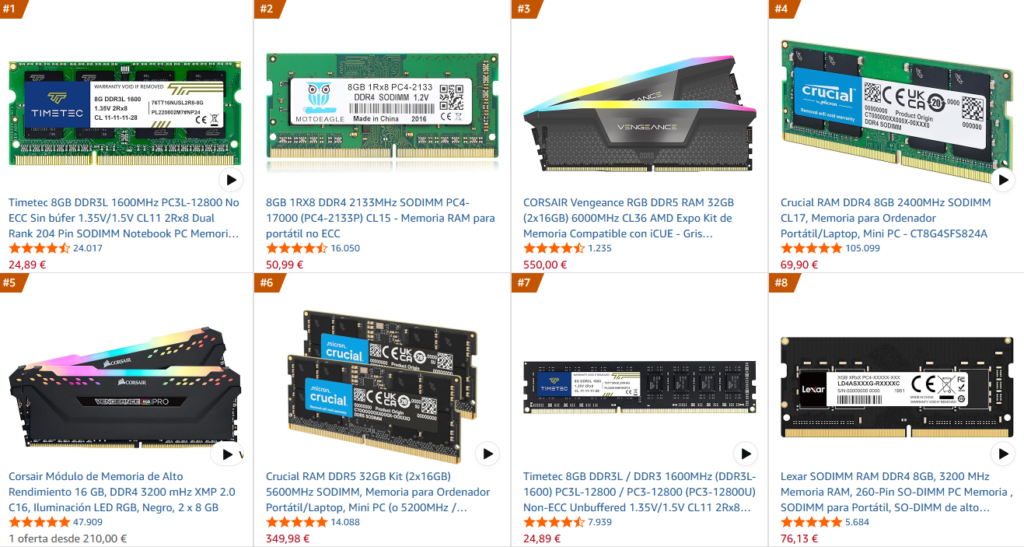 Las marcas de memoria RAM más buscadas y compradas en Amazon son: Corsair, Crucial, Timetec, Lexar, Samsung y Kingston.