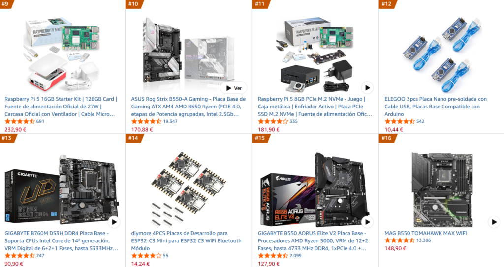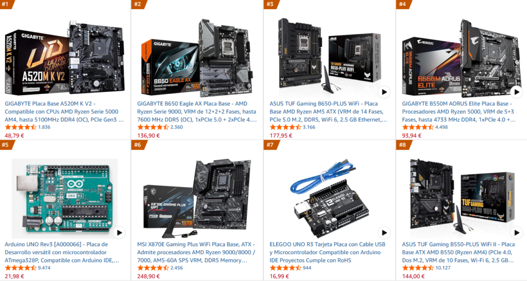 Las marcas de placas base más buscadas y compradas en Amazon son: GIGABYTE, ASUS y MSI
