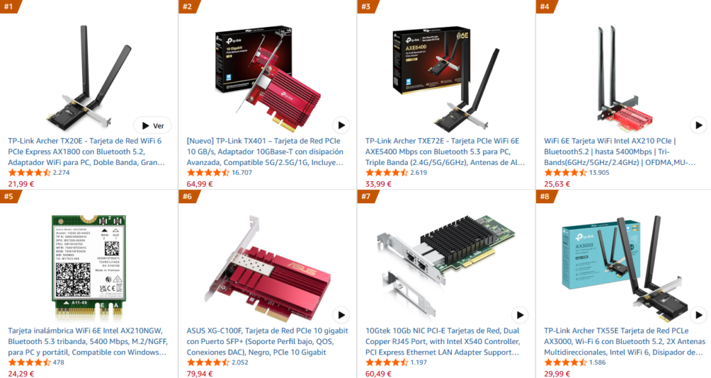 Las marcas de tarjeta de red más buscadas y vendidas en Amazon son: TP-Link, Intel y ASUS.