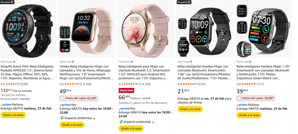 Las marcas de relojes inteligentes más buscadas y compradas en Amazon son: Amazfit, Xiaomi, Blackview, Samsung, Garmin, Huawei y Apple.